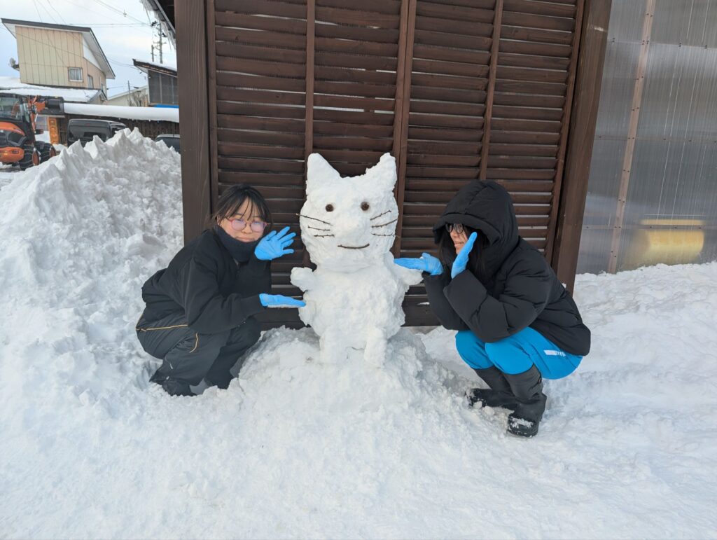 そしてHちゃんが「ケイコさん見てください!」と玄関前の通路を指さし「ぴーちぇすCatです!」30分くらいで雪だるま…ネコちゃんを完成させたそうです!「なんか真っ白で、目とかつけたいね!」ってことで⬇️