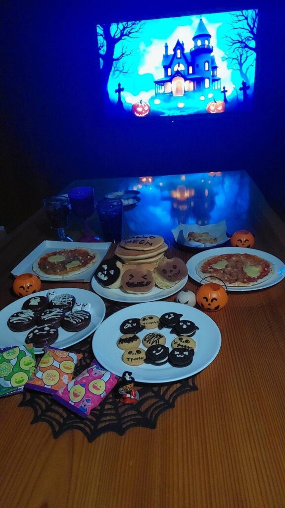 昨日夕方、リビングに1年生の3人が集まっていました!テーブルやカウンターには、お菓子やハロウィングッズ🎃がいっぱいです!